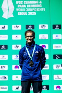 En 2019, j’ai repris la compétition en tant que para-athlète. Une reprise réussie puisque j’ai intégré l’équipe de France de para-escalade en 2023. Cette même année, j’ai obtenu plusieurs podiums internationaux dont un titre de champion du monde RP1. Depuis, j’ai enchaîné les championnats de France, d’Europe et les Coupes du monde, avec à chaque fois une place sur le podium. En parallèle, je travaille dans une salle d’escalade (Climb Up) et je me forme pour devenir moniteur.