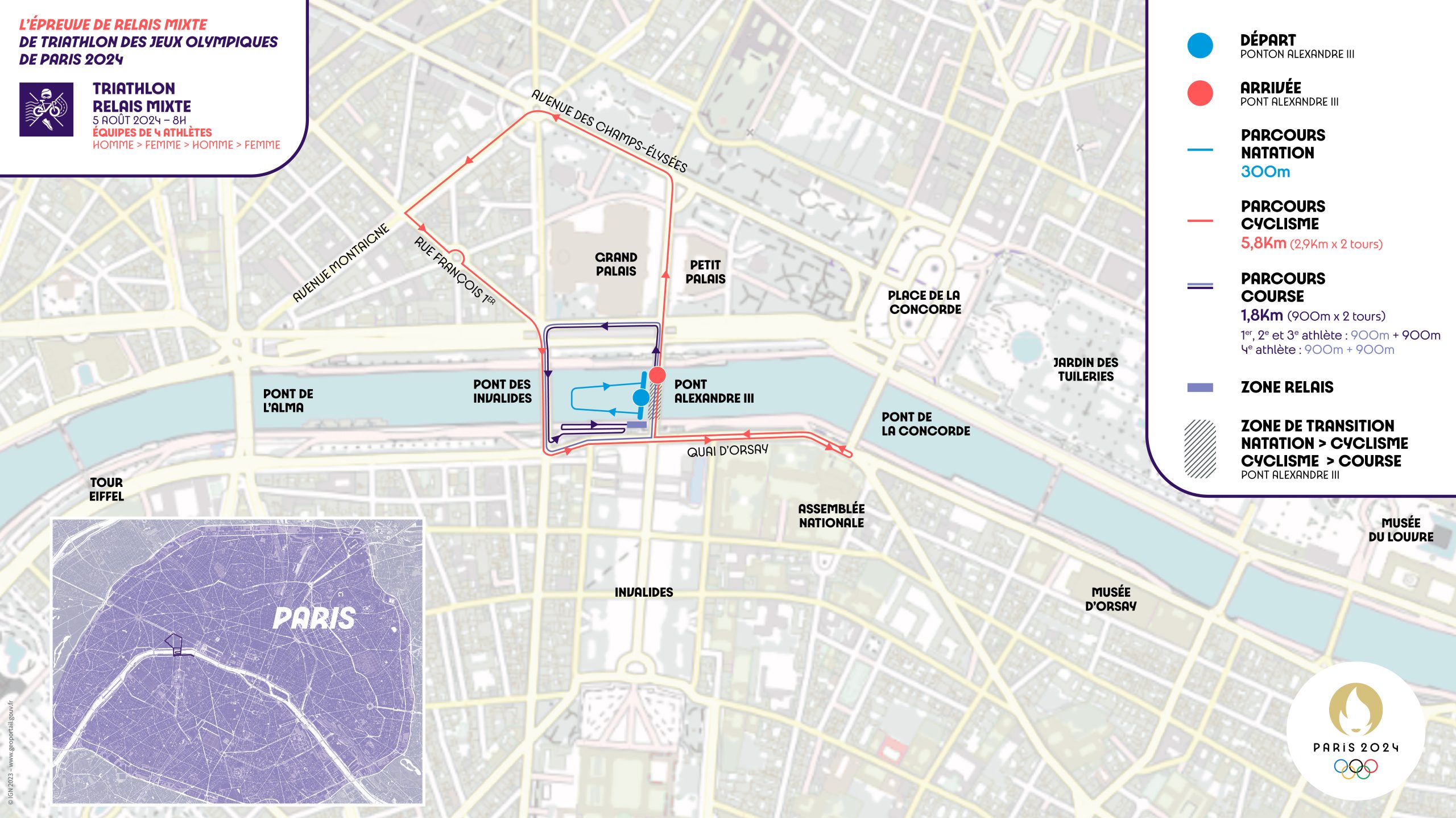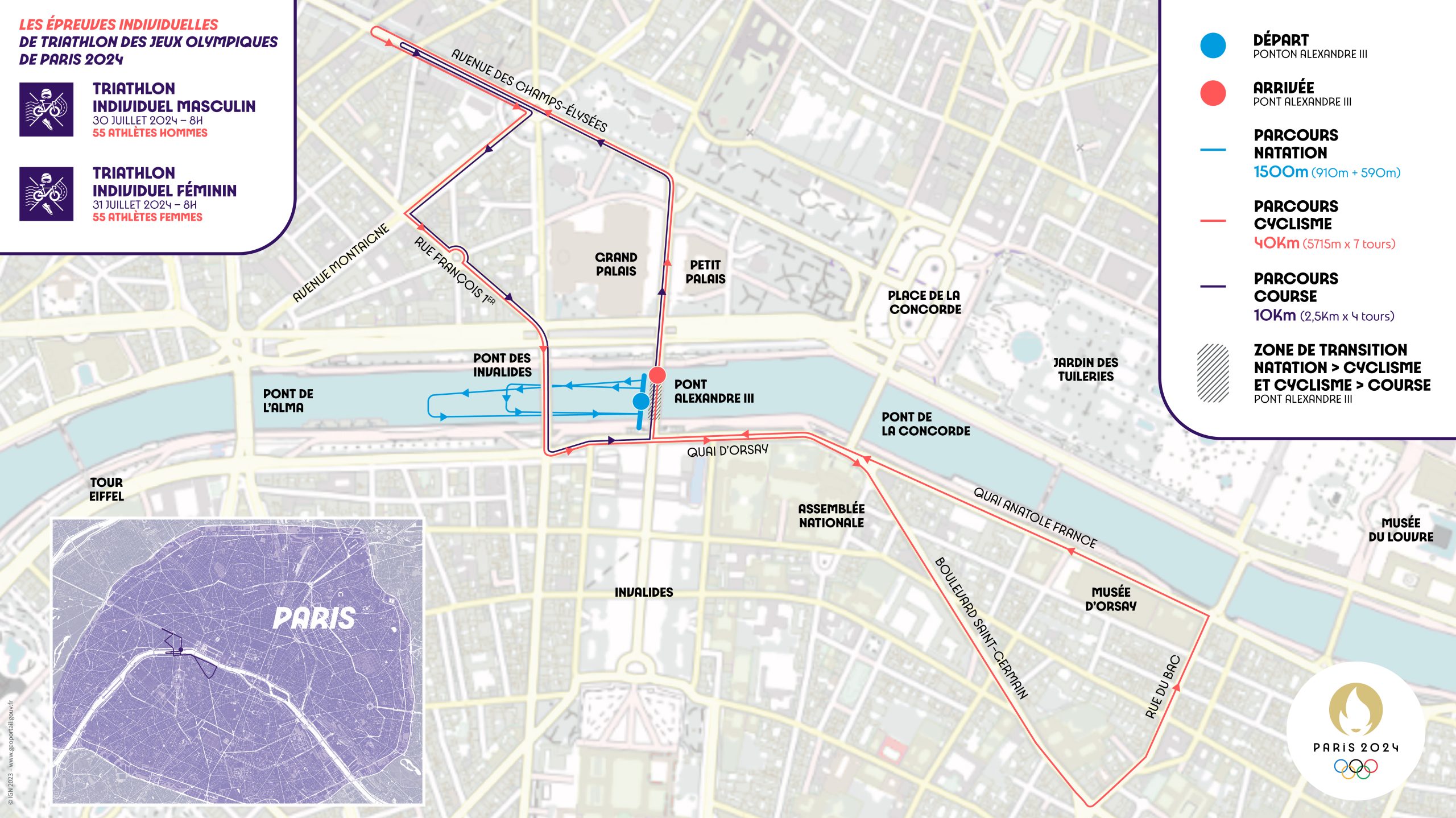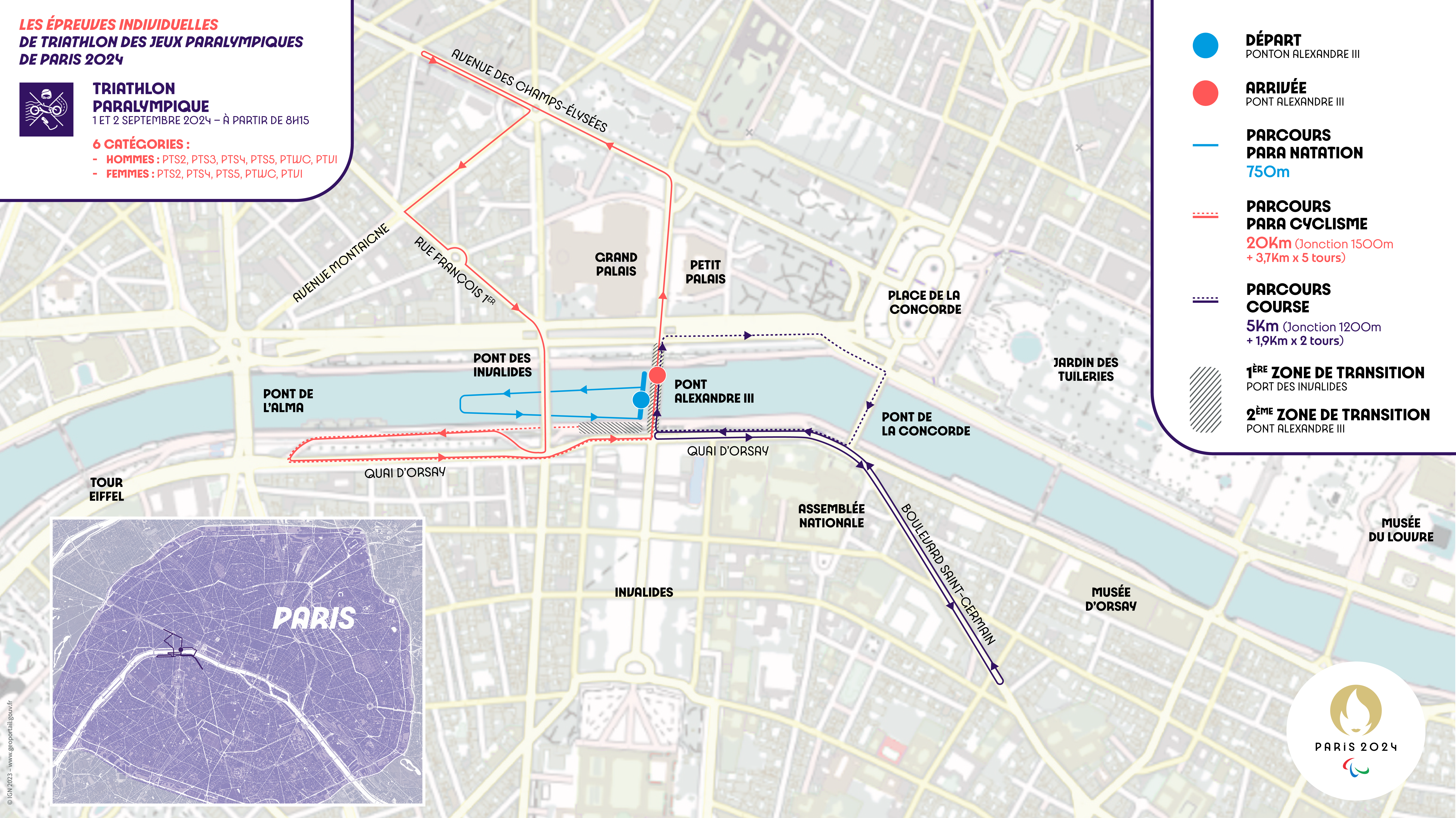 En avril dernier, le Comité Paralympique a dévoilé le parcours de l’épreuve de para triathlon. Au cœur de Paris, il fera s’élancer les sportifs dans les lieux les plus mythiques de la capitale. Le départ, comme l’arrivée, se feront sur le pont Alexandre III. L’épreuve de nage se fera entre ce pont et celui des Invalides. Pour le cyclisme, les athlètes s’élanceront sur les Champs Elysées et le Quai d’Orsay qu’ils fouleront également lors de la course. Un parcours urbain qui permettra de découvrir les monuments mythiques parisiens.