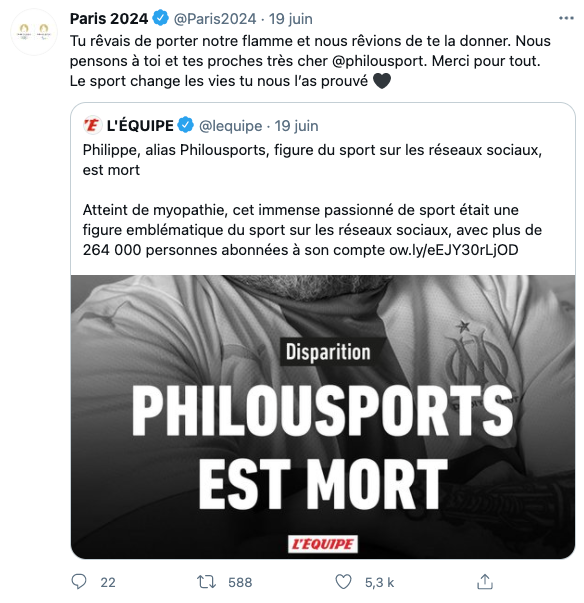 C’est avec une immense tristesse que nous avons appris la disparition de Philousports, samedi en fin d’après-midi. Décédé à 49 ans d’une crise cardiaque, il était atteint de myopathie, et faisait régner son aura bienveillante et généreuse sur Twitter depuis 10 ans. « Je ne savais pas que c’était impossible à cause de ma différence, alors je le fais », répétait ce passionné de sports qui était surtout un passionné de l’humain. Toute l’équipe Talentéo se voit très touchée par ce départ, lui qui a été président des derniers Talentéo Awards.